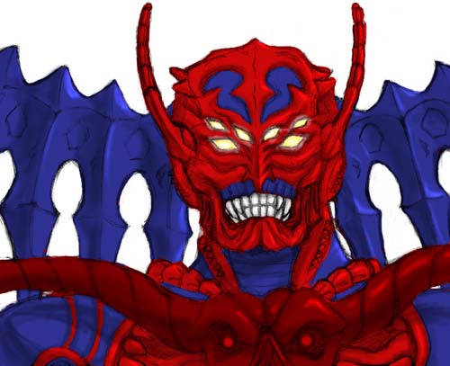 ドウコク様かっけえええええええええええ!!!! 絵としては設定画かよ!ってレベルのつまらなさで申し訳ない。 手前に何人か配置する構図の関係で、角度付けたらうるさくなるので、あえてのシンプルなのですよ… 本当はさらにアクマロとシタリも描きたかった。 この絵も完全に塗りかけなので、そのうちちゃんと塗って完成させたいなあ。