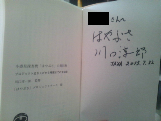 ちなみに、本にサインしていただいたんですが、 山ほどあるはやぶさ関連の本の中から、川口先生のサインを入れていただくなら 「はやぶさ、そうまでして君は」が一番妥当かなあ、と思ったんですが あまりにもスタンダードすぎてにわかっぽいし、 単なるミーハーだと思われる懸念があるので あえてのブルーバックス「小惑星探査機はやぶさの超技術」をチョイスして、 マニアっぷりと本気度をアピールしてみた! …まあ、ぶっちゃけ、にわかのミーハーファンですけどネ☆(笑) でも、先生がサインされる時ちょっと嬉しそうだったと言うことなので 選択は間違っていなかった。たぶん。